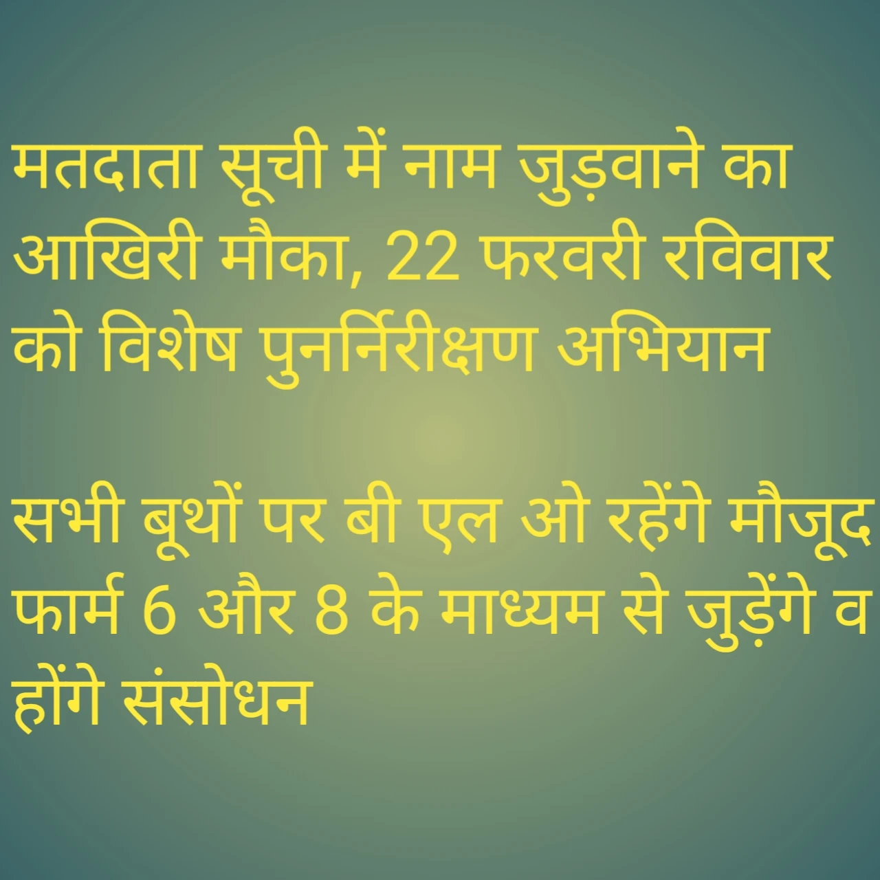 अपना नाम जुड़वाएं,संसोधन कराएं और देखें मतदाता सूची में अपना नाम,सभी बूथों पर बी एल ओ रहेंगे उपस्थित