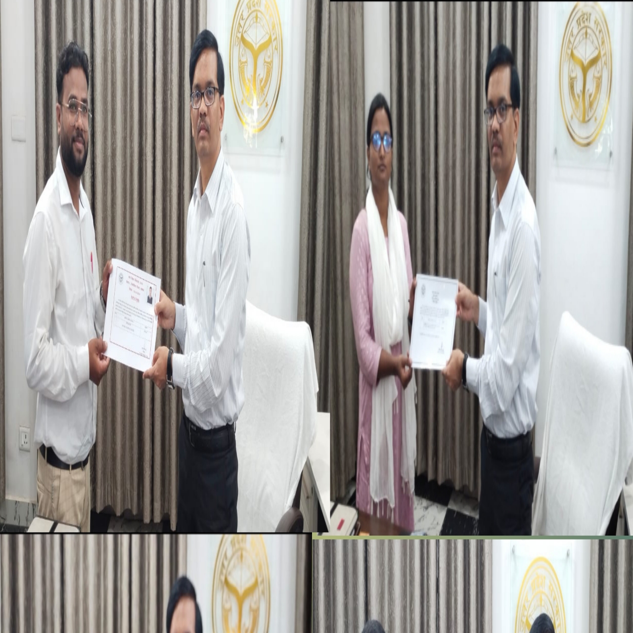जिलाधिकारी श्री प्रवीण कुमार लक्षकार ने कार्यालय कक्ष में जिला पंचायत में अवर अभियंता पद पर चयनित श्री विश्वजीत यादव व श्री शशि भूषण तथा ग्रामीण अभियंत्रण विभाग में अवर अभियंता पद पर चयनित कु०अदिति एव आवास व शहरी नियोजन विभाग में अवर अभियंता पद पर चयनित राम चौहान को नियुक्ति पत्र वितरित किया।