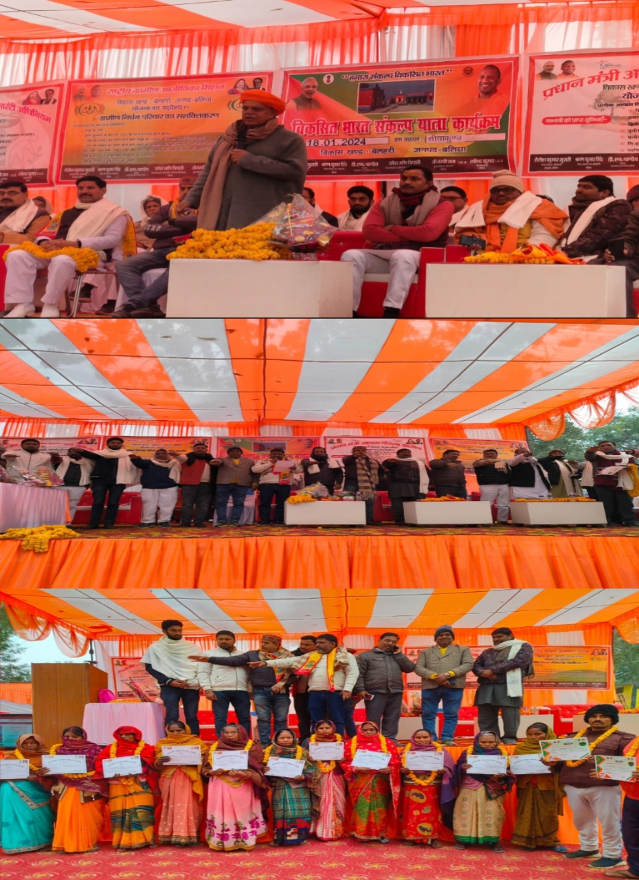 हल्दी। विकसित भारत संकल्प यात्रा का आयोजन बेलहरी विकास खण्ड के ग्राम सभा सीताकुंड में लक्ष्मी नारायण चौबे छोटे के नेतृत्व में हुआ जिसके कार्यक्रम के मुख्य अतिथि सांसद वीरेंद्र सिंह मस्त ने संबोधित करते हुए कहा कि हमारा देश दिल्ली मुंबई जैसे शहरों में नहीं बल्कि गांवों में बसता है इसलिए गांवों का विकास ही देश का विकास होगा।उन्होंने कहा कि लोकतंत्र कि पहली इकाई ग्राम पंचायत है इसलिए गांवों में लोकसंवाद का आयोजन किया जा रहा है जिससे सरकार और सरकारी कर्मचारी अपने योजनाओं को सर्वजन तक पहुंचाएं। पूर्व ब्लाक प्रमुख मृत्यंजय तिवारी बब्लू ने कहा कि सरकार की योजनाओं को जन-जन तक पहुंचाने का काम सरकारी तंत्र इस आयोजन के द्वारा कर रहा और सरकार का लक्ष्य है अंतिम व्यक्ति तक सरकारी योजनाओं को पहुंचाना।परिवहन मंत्री प्रतिनिधि हर्ष सिंह ने आयुष्मान भारत योजना सहित सरकार कि योजनाओं के बारे में बताया। समाजसेवी सुशांत कुमार पाण्डेय ने विकसित भारत संकल्प यात्रा का उद्देश्य बताते हुए आम जन के अधिकारों का उल्लेख किया। सुधीर पाण्डेय ने किसानों को कृषि विभाग के योजनाओं के बारे में बताया।इस मौके पर खंड विकास अधिकारी बेलहरी, ग्राम पंचायत सचिव, खंड शिक्षा अधिकारी, भाजपा मंडल अध्यक्ष रिंकु दुबे,नारायण जी, सुशांत कुमार पाण्डेय, आदि मौजूद थे।