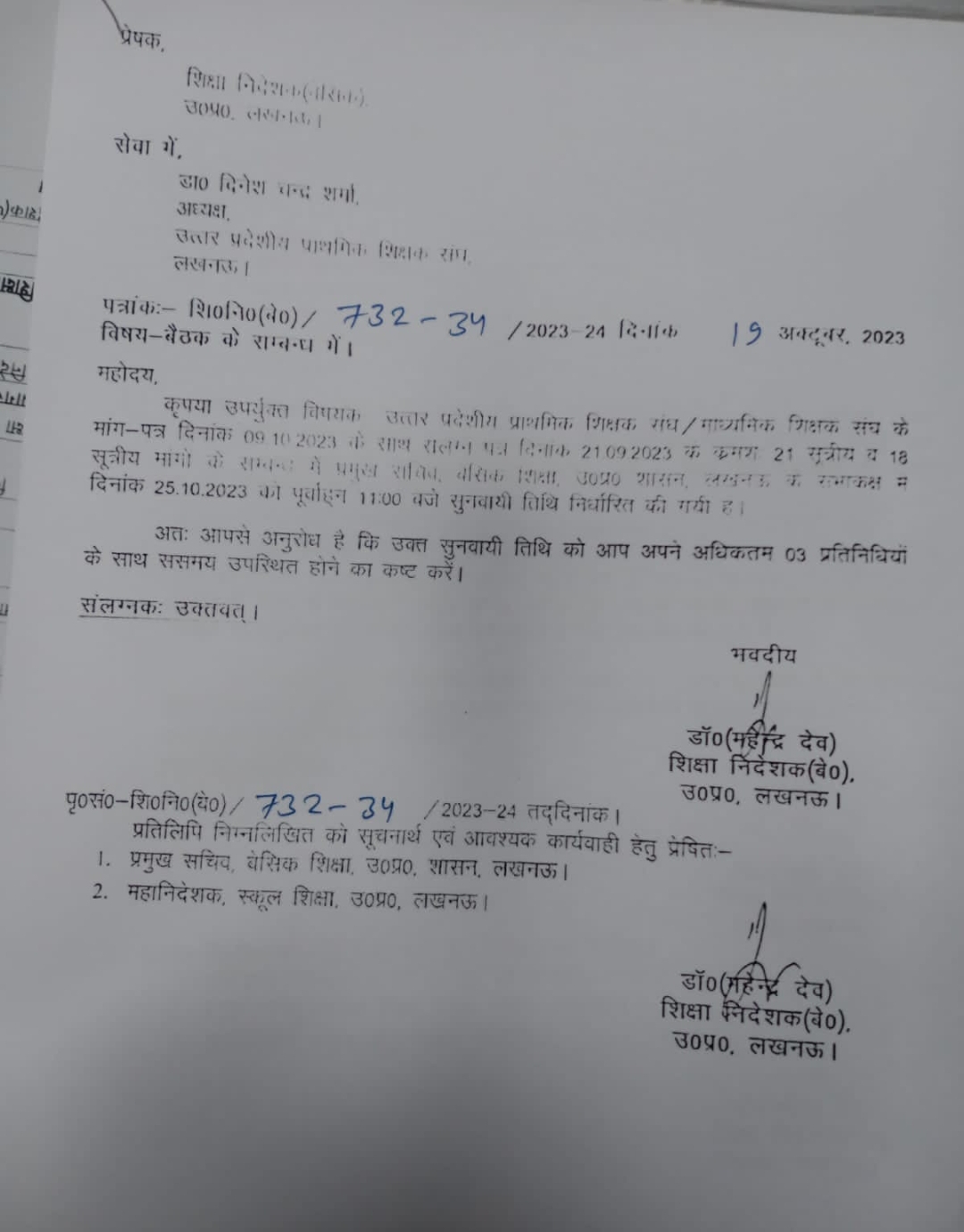 प्रदेशीय प्राथमिक शिक्षक संघ उत्तर प्रदेश के प्रान्तीय अध्यक्ष डां दिनेश चन्द्र शर्मा को पत्र लिखकर शिक्षा निदेशक (बेसिक )ने 25 अक्टूबर को 11 बजे अपने तीन प्रतिनिधियों को लेकर प्रमुख सचिव के साथ वार्ता हेतु बुलाया है।
