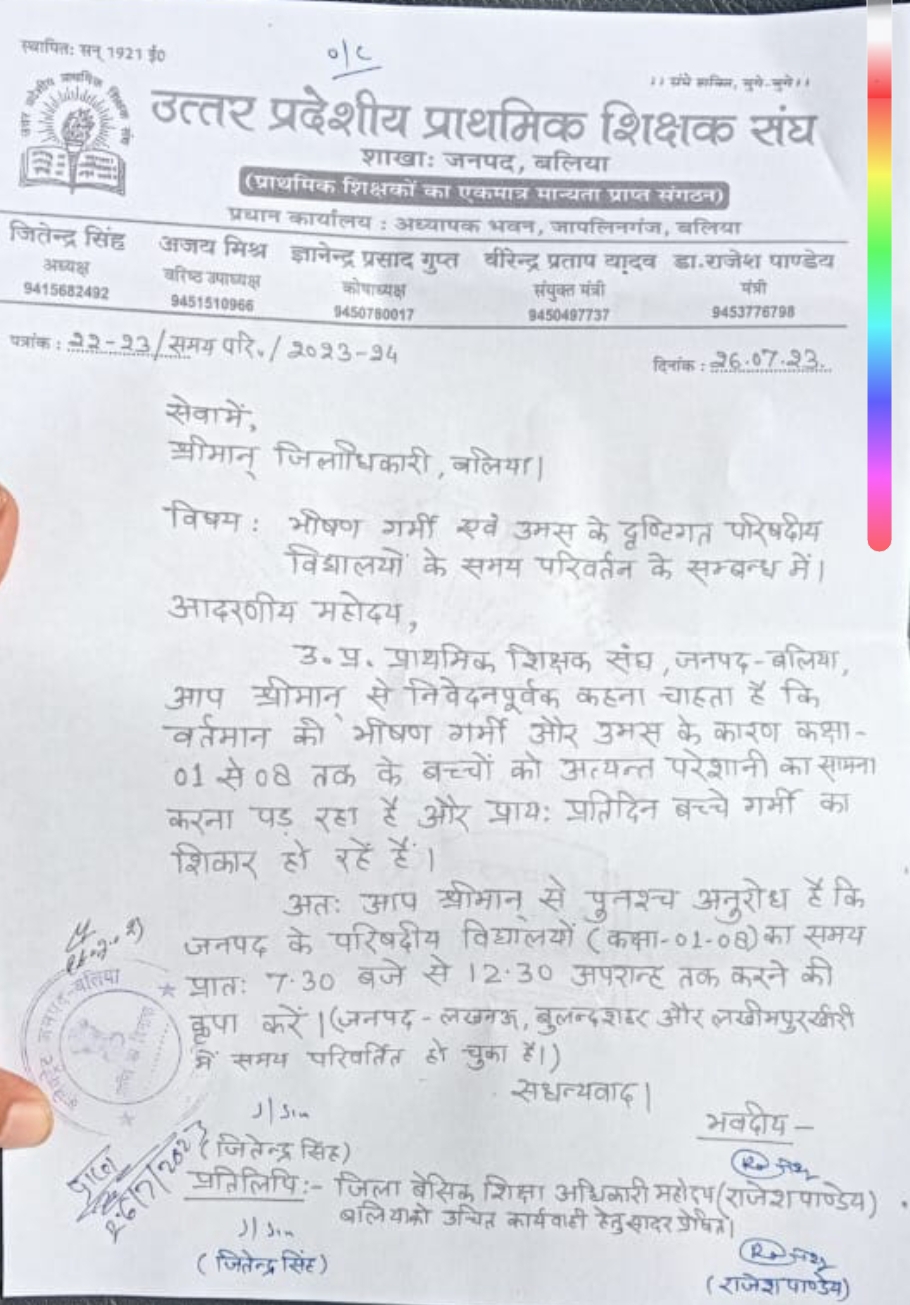 बलिया। उत्तर प्रदेशीय प्राथमिक शिक्षक संघ ने जिलाधिकारी को पत्र लिखकर विद्यालय का संचालन समय बदलने की मांग किया है। संघ ने बताया है कि विद्यालयों में गर्मी से बच्चे बेहोश हो जा रहे हैं,रसोइयों के बेहोश होने की भी सूचना है। बच्चे सबेरे 7.30 पर आ जाते हैं और ऐसे में इस भीषण गर्मी में 2 बजे तक उनका विद्यालय में रुकना और फिर दोपहर की गर्मी में घर तक जाना एक दुरुह कार्य है,वैसे भी इन बच्चों के पढ़ने के घंटे 3-4 घंटे से अधिक नहीं होना चाहिए। ऐसे में संघ के जिलाध्यक्ष जितेन्द्र सिंह और मंत्री डां राजेश पाण्डेय ने 7.30 से 12.30 पांच घंटे का विद्यालय करने की मांग जिलाधिकारी से किया है। उल्लेखनीय है कि तीन जनपदों में पहले ही यह समय परिवर्तन हो चुका है।