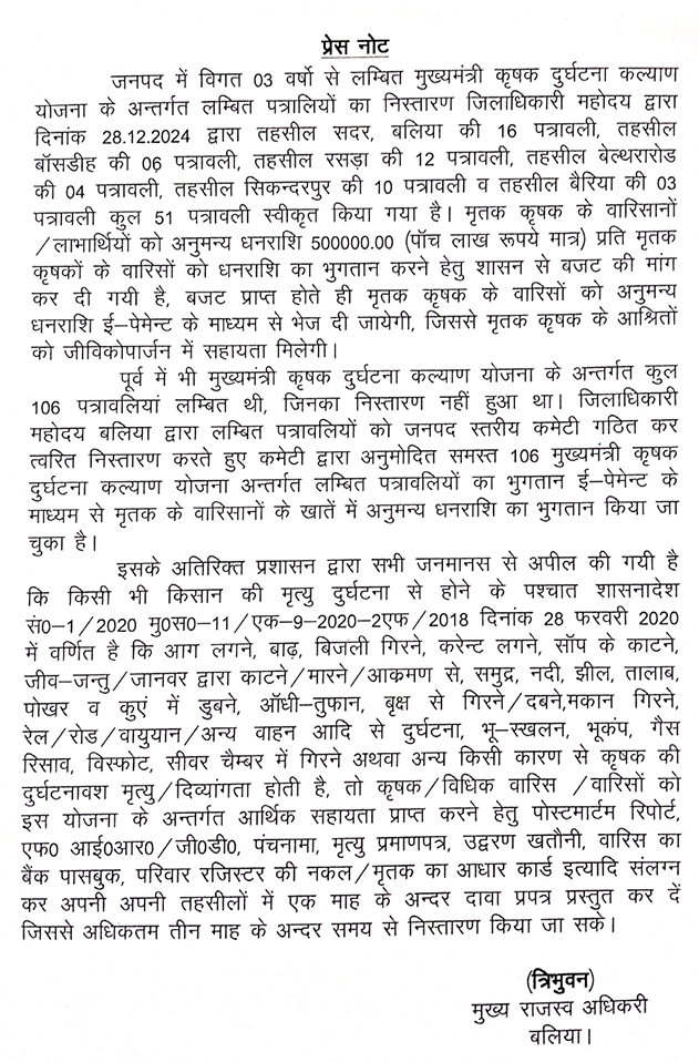 : कृषक दुर्घटना कल्याण योजना के अन्तर्गत 51 पत्रावलियों यानि 51व्यक्तियों को 5-5 लाख रुपया मृतक किसानों के वारिसानों को दिए जाने का निर्देश